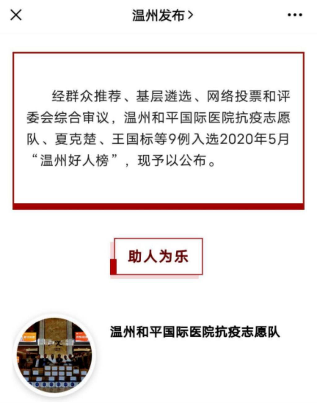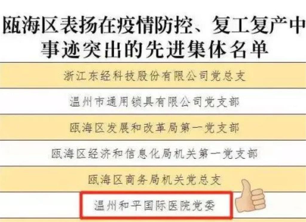 醫(yī)院榮獲“溫州好人”集體稱號(hào),醫(yī)護(hù)人員呂寧寧、侯文杰等獲得感動(dòng)甌海100人、最美抗疫先鋒等稱號(hào)。