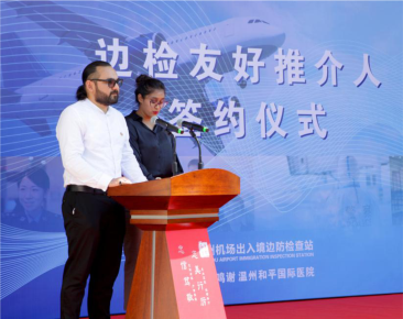 9月17日,溫州機(jī)場(chǎng)出入境邊防檢查站舉行“邊檢友好推介人”簽約儀式,溫州和平國(guó)際醫(yī)院醫(yī)生豪孟德Hamad Abdul Zahir、蘇瑪Sumayyah Hosany夫婦受邀擔(dān)任該站“邊檢友好推介人”,頒發(fā)榮譽(yù)聘書(shū),夫婦二人今后將參與到該站外國(guó)旅客出入境政策解讀宣講、出入境注意事項(xiàng)指引等工作中。