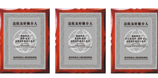 溫州機(jī)場(chǎng)出入境邊防檢查站站長(zhǎng)劉浩與豪孟德、蘇瑪夫婦簽約,并為他們頒發(fā)榮譽(yù)聘書(shū)。