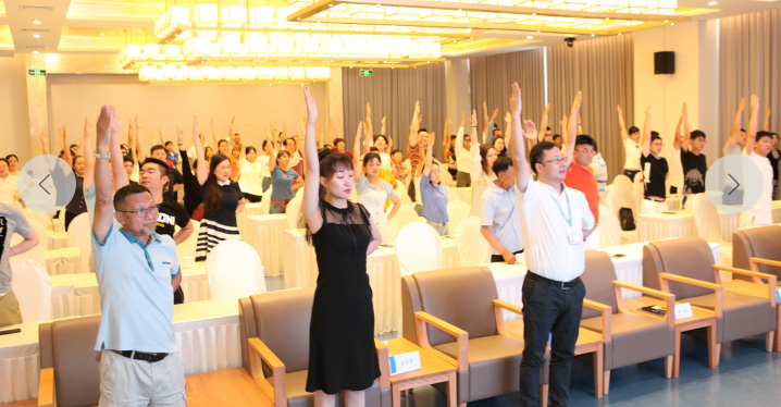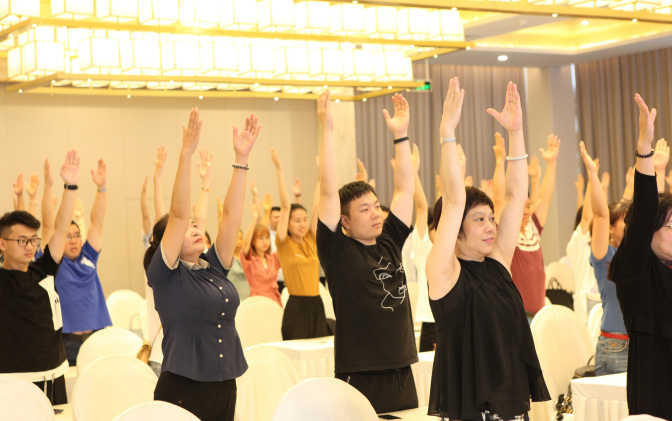 黃鵬現(xiàn)場示范脊柱日?;謴?fù)四步操,教會大家“世界上最正確的站立和行走”,全場站立做操。