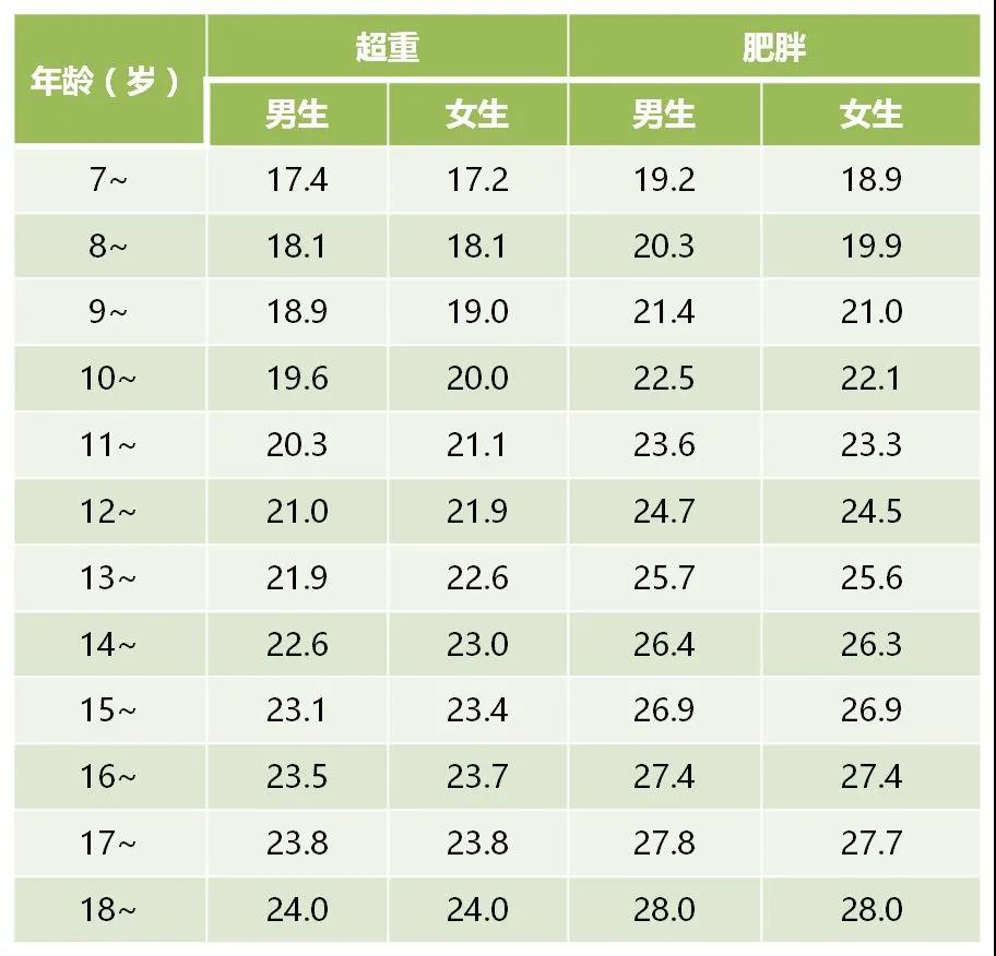 我們可以參照一個(gè)指標(biāo)——體質(zhì)指數(shù),簡稱BMI。BMI的計(jì)算公式為體重(kg)除以身高的平方(㎡)。再參照BMI篩查數(shù)值標(biāo)準(zhǔn)表,就可以判斷孩子是否超重或肥胖了。