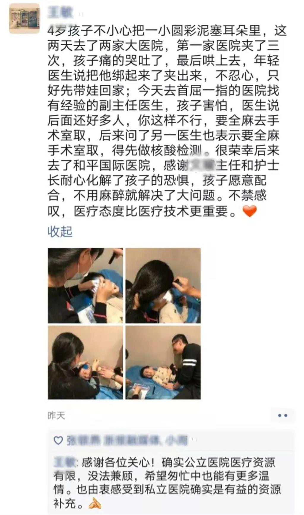 為了盡快治療輝輝,周丹還跑回家拿了采耳工具。為了安撫他的情緒,周丹準(zhǔn)備了他喜歡看的動(dòng)畫片。在夾取彩泥的過程中,她還不斷地安撫輝輝,讓他放松心情,輝輝也意外地配合,全程沒有哭鬧。很快,他耳朵里的大部分彩泥就處理干凈了。